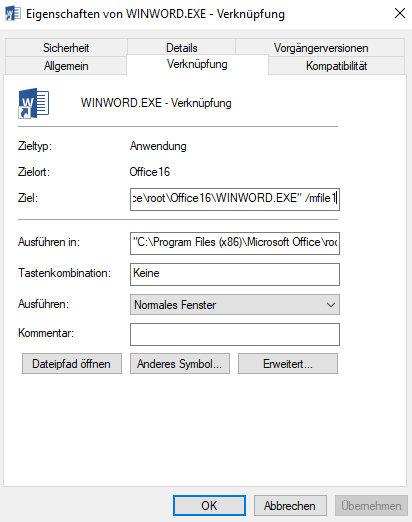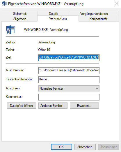 Nun wechseln Sie auf die Registerkarte „Verknüpfung“. In dem Feld „Ziehl“ sehen Sie den Pfad unter dem Word installiert ist.
