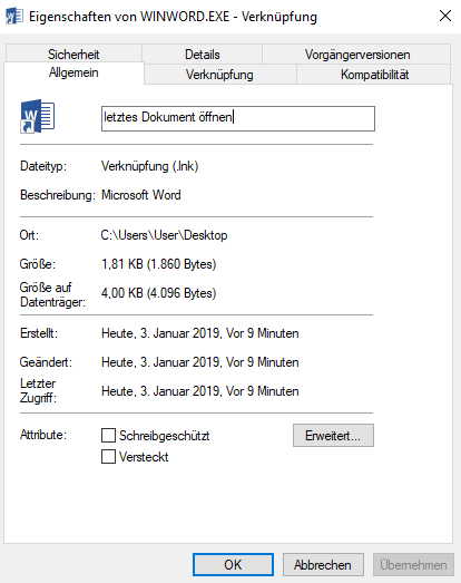 Sollte die Verknüpfung nicht richtig arbeiten, überprüfen Sie bitte die Schreibweise in den Eigenschaften der Verknüpfung.