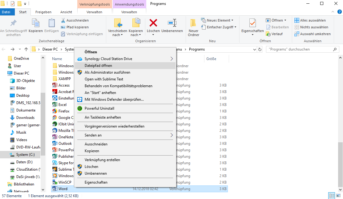 Nach einem Klick auf "Dateispeicherort öffnen", öffnet sich ein Fenster mit Verknüpfungen. Die Verknüpfung die hier interesiert ist bereits markiert. Nach einem rechtsklick öffnet sich das Kontextmenü. Hier klicken Sie auf "Dateipfad öffnen".