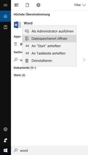Dazu geben Sie in die Windowssuche den Suchbegriff "Word" ohne Anführungszeichen ein. Die Suche finden Sie entweder in der Taskleist oder Sie öffnen einfach das Startmenü und beginnen den Suchbegriff zu tippen.
